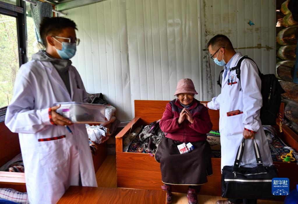 返程的途中,又有兩位白叟攔住了汽車,他們得知當天送醫上門的新聞,便等待在離村幾公里的汽車零件報價處所。于是,在路邊的樹下,王振疆醫生又帶著尼瑪益西為兩位白叟進行了診療。